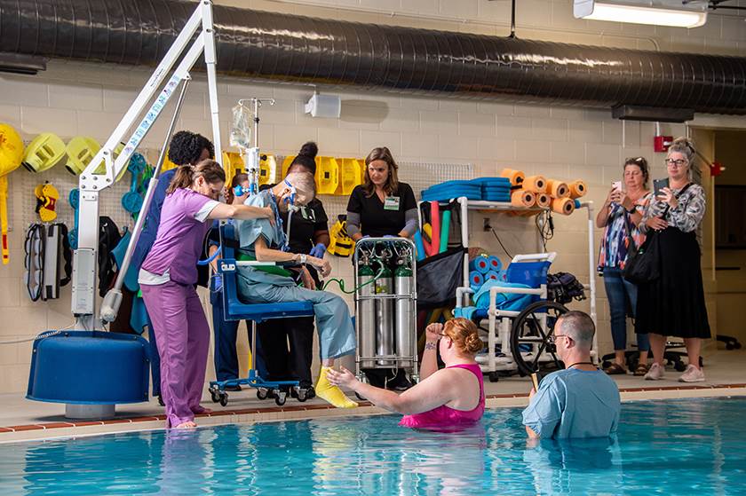 “Dr. Nichols deixou claro que ele só poderia ficar sem oxigênio por alguns segundos, o que significava que não poderíamos rolar pela rampa na cadeira de rodas da piscina, então tivemos que usar o teleférico para colocá-lo na piscina ”, Agricola disse.